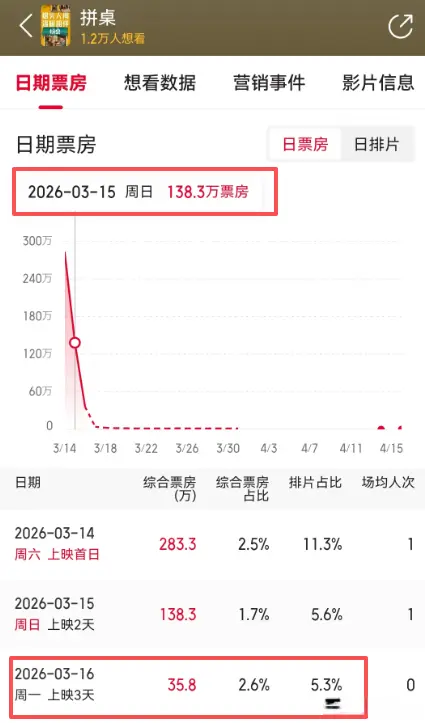 可谁敢信,这回王传君扛番的《拼桌》展望票房唯有906万,日票房更是从百万一齐跌到35万。