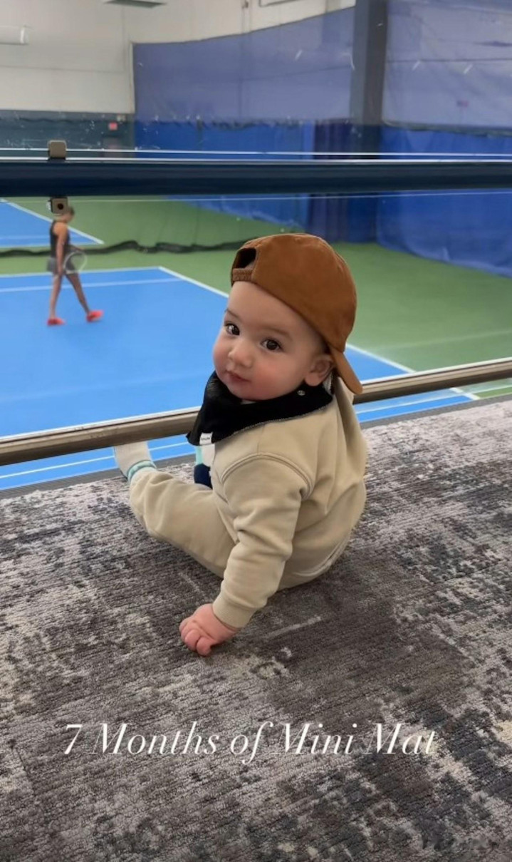 7个月大的Brooklyn 穿戴蓝色连体衣,挂着玄色涎水兜,胖嘟嘟的小脸肉感全王人,头发天然疏淡但五官俊俏,一眼就能看出像极了澳大利亚籍的爸爸Mathew。