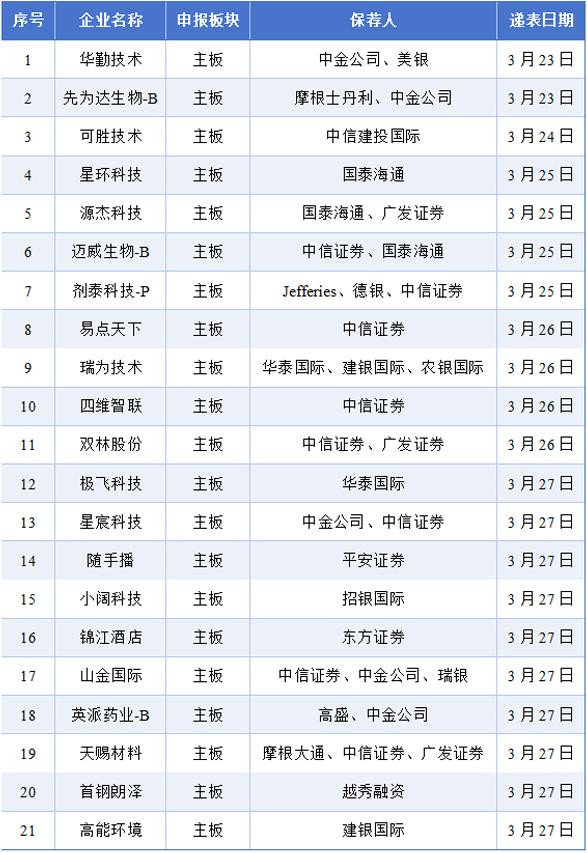3月22日至3月28日历间华勤技能、先为达生物-B、可胜技能、星环科技、源杰科技、迈威生物-B、剂泰科技-P、易点世界、瑞为技能、四维智联、双林股份、极飞科技、星宸科技、顺手播、小阔科技、锦江栈房、山金海外、英派药业-B、天赐材料、首钢朗泽、高能环境向港交所递交上市央求;其中华勤技能、星环科技、源杰科技、迈威生物-B、易点世界、双林股份、星宸科技、锦江栈房、山金海外、天赐材料、高能环境已登录A股。