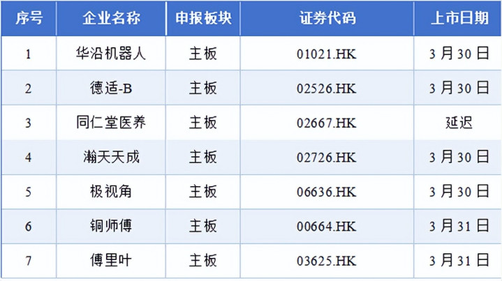 3月22日至3月28日历间,华沿机器东谈主、德适-B、同仁堂医养、瀚天天成、极视角、铜师父、傅里叶开动招股,同期7家企业已完成招股。其中,同仁堂医养蔓延上市。